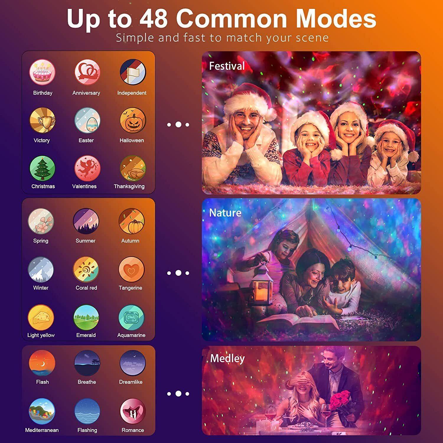 48 Preset Scene Effects and Custom DIY Scene Via phone App, choose from vibrant animated effects based on nature, emotions, holidays, birthday, festival, party and more to find the proper lighting effects that fit your emotions. The create custom scene function is a huge help, through varying levels of brightness and speed, color and stars options, Dynamic selection to build your very own favorite effects, create personalized lighting for your gaming room, living room, bedroom etc.